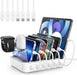 This station comes with seven mixed cables—including iPhone, USB-C, and Micro USB—plus dedicated holders for earbuds and iWatch. The adjustable dividers fit phones, tablets, and even devices with thick protective cases.
